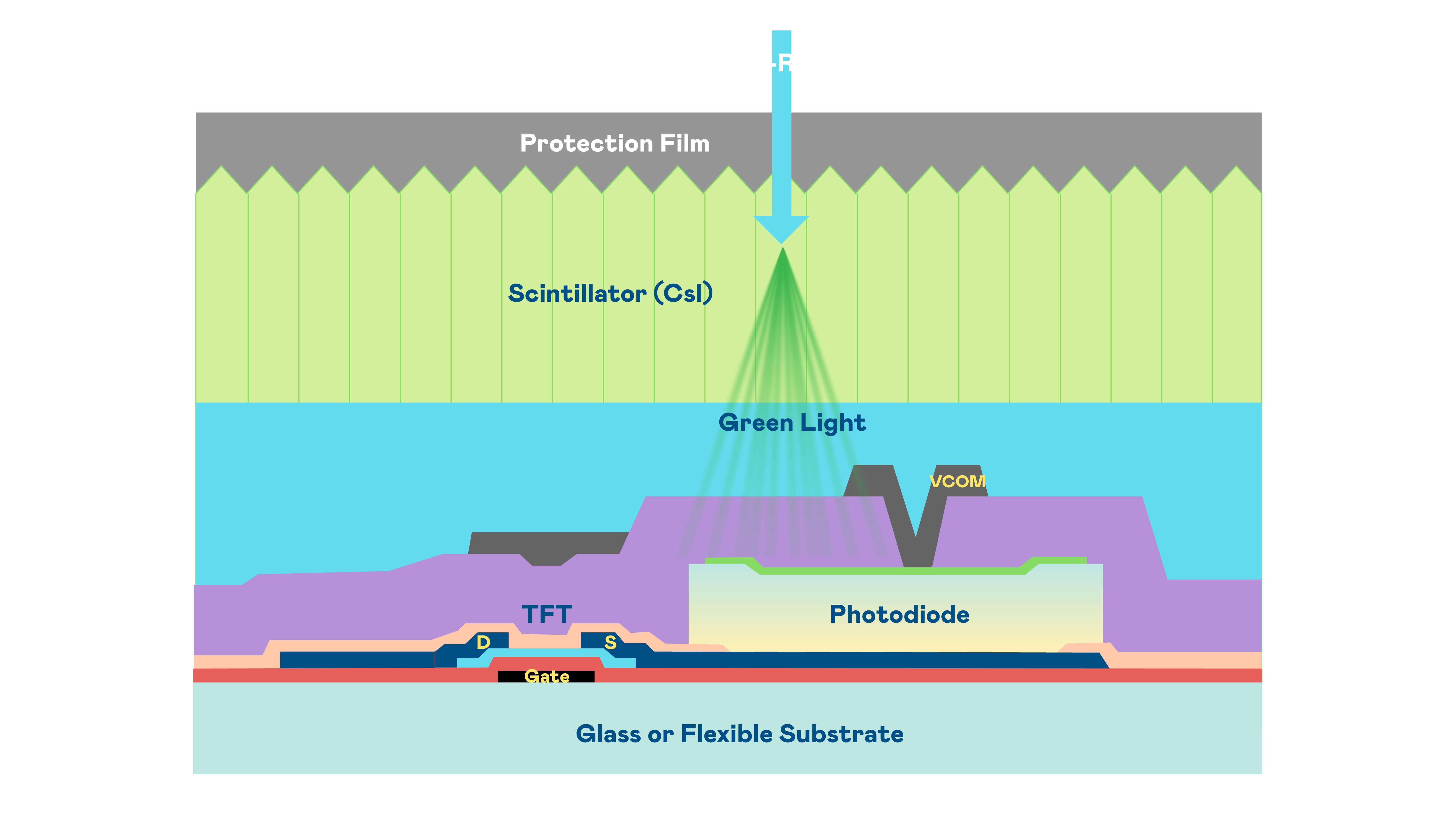 凯发娱乐的X光影像感测阵列使用薄膜电晶体 (TFT) 作为每个像素的读取开关,搭配光电二极体(Photodiode)的光电转换元件,用以感测X光影像讯号。