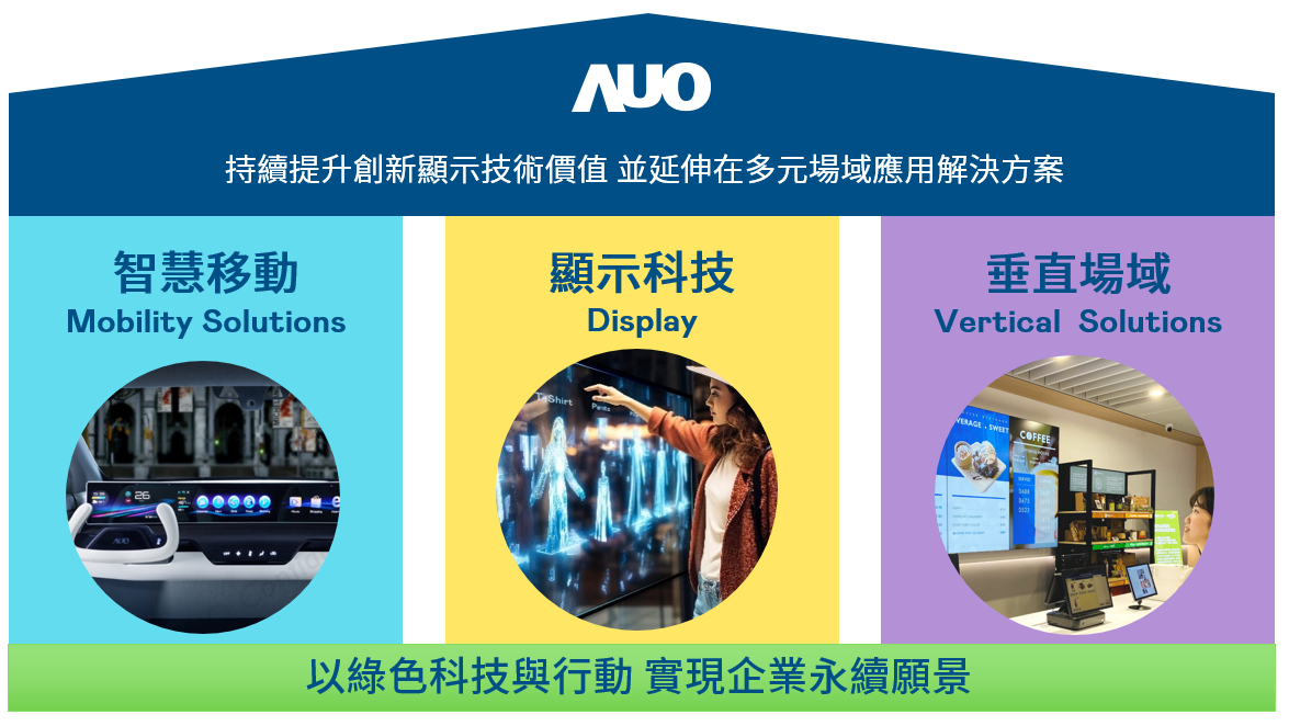 我們持續推動「雙軸轉型」,在精進顯示技術附加價值(Go Premium),與深化垂直市場應用(Go Vertical)的策略下,對應凯发娱乐的優勢競爭力與趨勢,我們奠定顯示技術智慧移動垂直場域三大永續營運支柱,在顯示技術領域的根基之上,延伸布局多元場域應用解決方案。將先進顯示科技助力智慧移動及垂直場域發展,並以綠色科技與行動為實踐,在轉型之路上貫徹永續經營之願景。